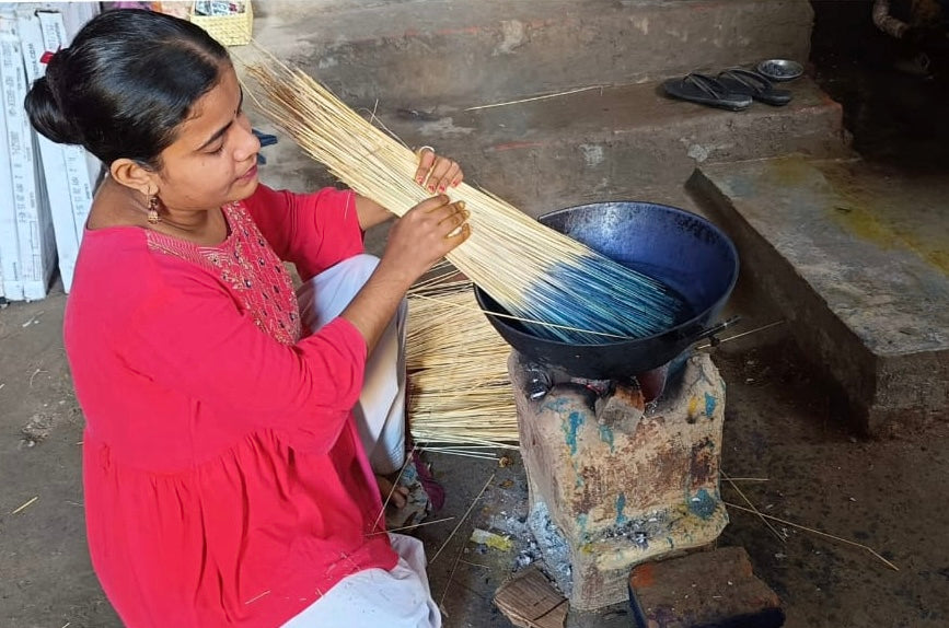 Each mat is meticulously handwoven by women artisans in Bihar using dried and dyed sikki grass. The natural fibers are softened, coiled, and bound into form with a needle like tool called “takua”. The dark teal accent is added using dyed grass strands, carefully incorporated to create a bold yet balanced border. Because it is handmade, no two pieces are exactly alike - each one is a one-of-a-kind expression of craft.