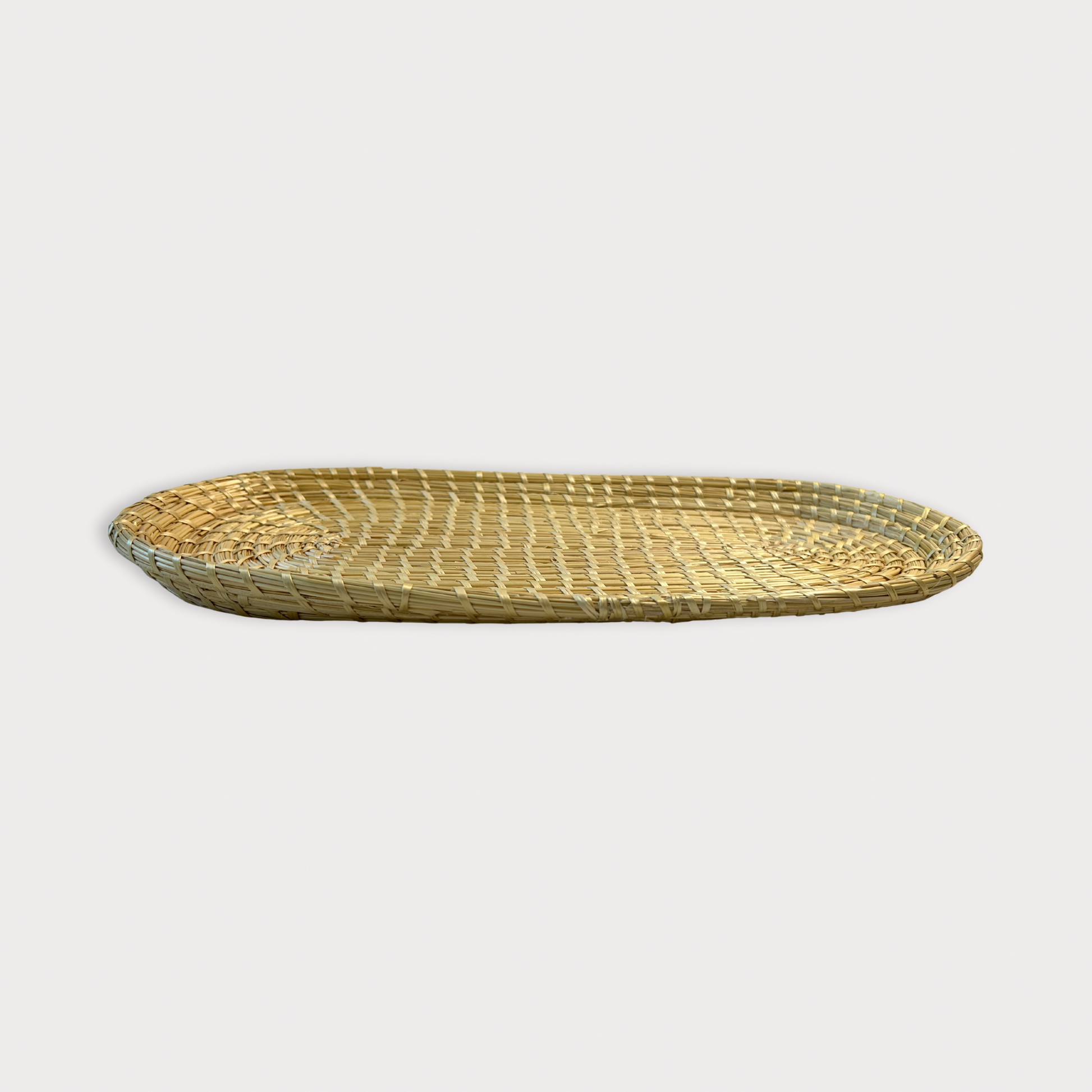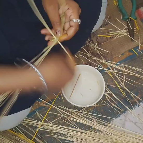 The tray is handwoven by women artisans in Bihar using sun-dried sikki grass. The grass is softened, coiled, and stitched into shape using a metal needle called “takua”. Its clean, minimalist form showcases the intrinsic sheen of natural sikki — a celebration of the material’s purity and the maker’s skill. Every piece is unique, reflecting subtle variations in texture and tone that mark true handmade craftsmanship.